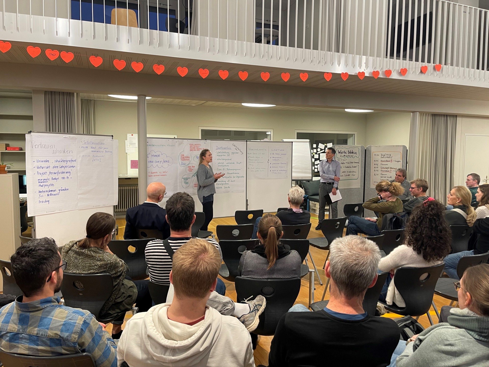 Wiederum wurde sehr intensiv diskutiert und gearbeitet. Resultat waren teilweise fast fertig ausgearbeitete neue gemeinsame Projektideen, so z. B. ein gemeinsamer Dankesanlass fĂŒr besonders engagierte SchĂŒlerInnen, von den SchĂŒlerInnen gestaltete Werteplakate, ein Mutprojekt und ein gemeinsamer Lichtweg. Daneben sah man aber auch konkrete Möglichkeiten, bereits Bestehendes an den Schulen besser zu vernetzen und fĂŒr alle der andern drei Schulen zugĂ€nglich zu machen, wie z. B. die Rocknacht, die Projekte «Make» und «Freiday».